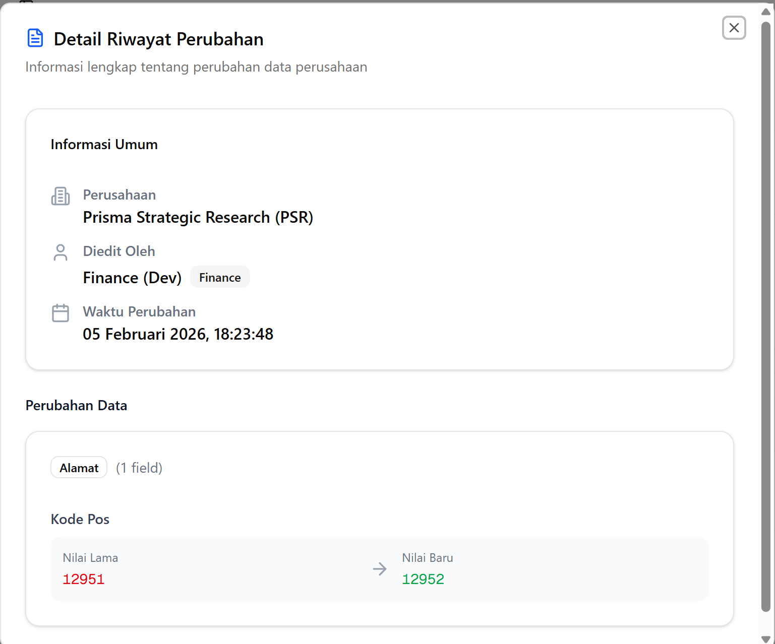 Sistem kini mencatat "Jejak Digital" setiap perubahan untuk keamanan data. Setiap kali data perusahaan diedit, sistem merekam Siapa (User), Kapan (Waktu), dan Apa (Perubahan Data).