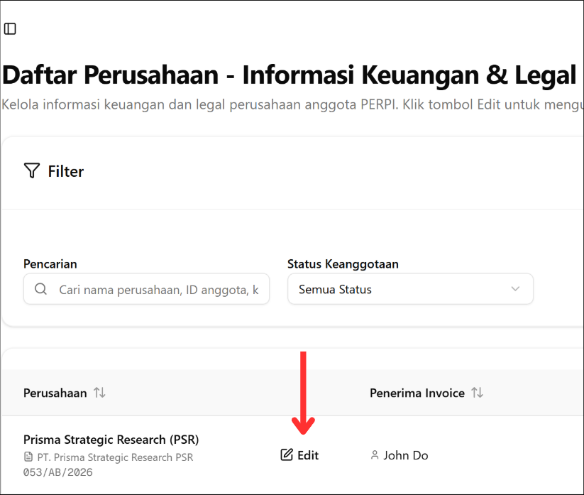 Cara Penggunaan: Pergi ke Sidebar > Menu Perusahaan > Pilih Perusahaan > Klik Edit.