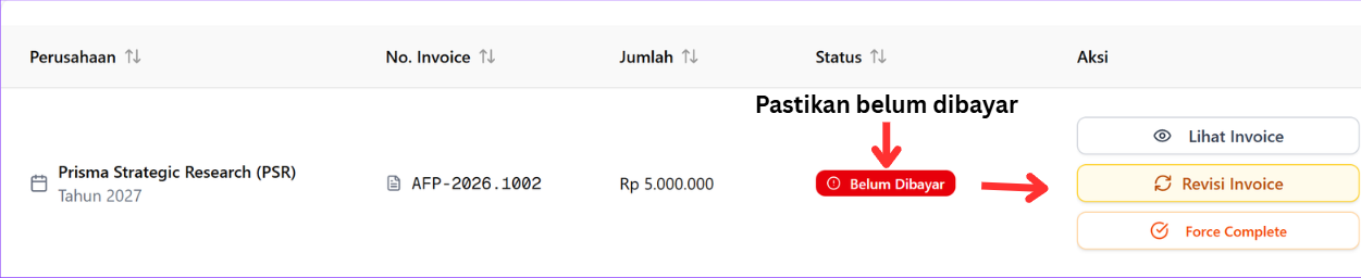 Sistem menampilkan tombol Revisi Invoice. Gunakan ini untuk memperbaiki Invoice tagihan yang belum lunas.