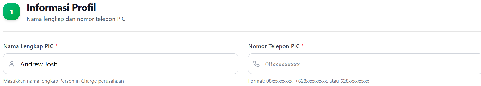 Nama PIC akan digunakan dalam semua komunikasi resmi. Pastikan menggunakan nama lengkap yang sesuai dengan identitas.