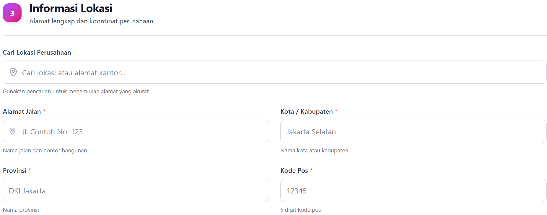 Anda dapat menggunakan search bar Cari Lokasi Perusahaan untuk autofill alamat.