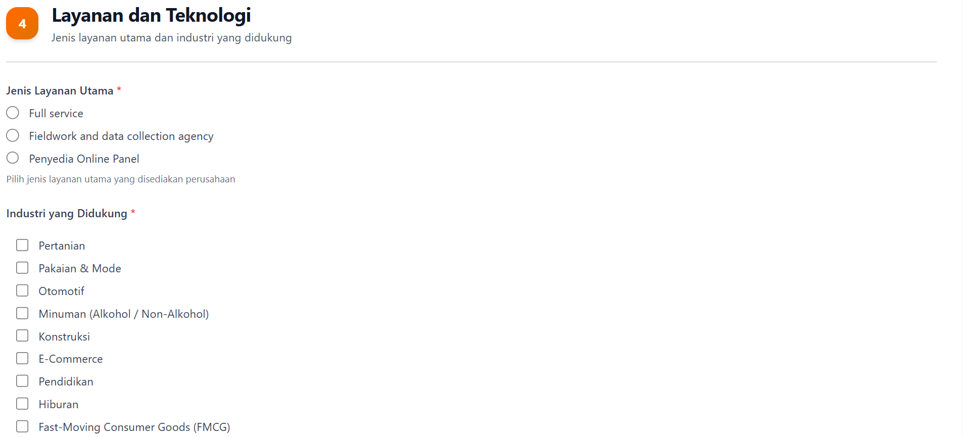 Pilih industri utama yang menjadi fokus atau spesialisasi perusahaan riset Anda. Ini membantu PERPI memahami expertise area Anda.