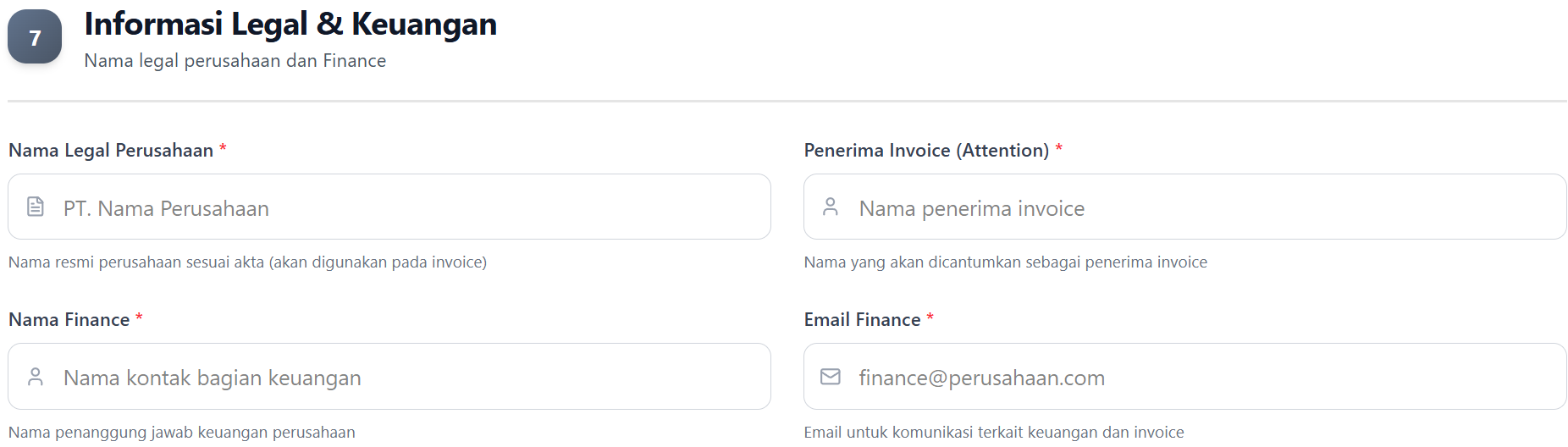 - Deskripsi: Email finance perusahaan untuk tujuan komunikasi keuangan (akan menerima email invoice dan sertifikat)