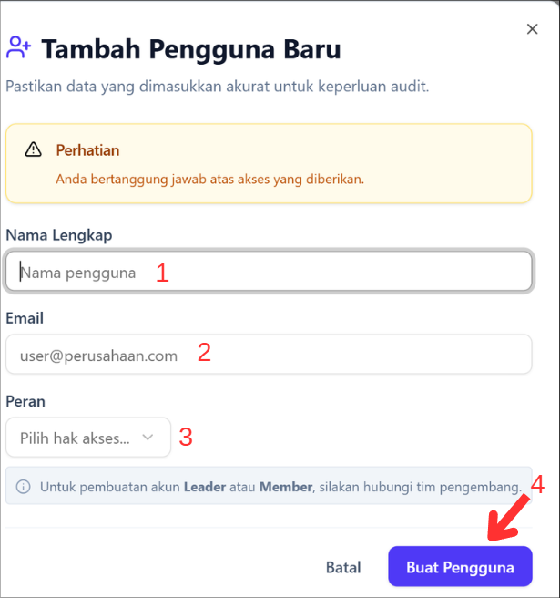 Setelah tombol diklik, akan muncul modal popup Tambah Pengguna Baru. Pastikan data yang dimasukkan akurat untuk keperluan audit.