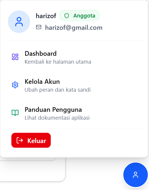 Seletah anda berhasil login floating button manajemen pengguna muncul di pojok kanan bawah layar pada semua halaman.