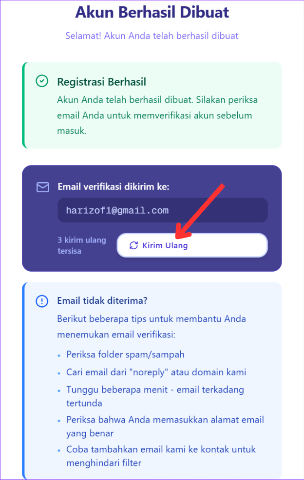 - Klik tombol "Kirim Ulang Email Verifikasi"